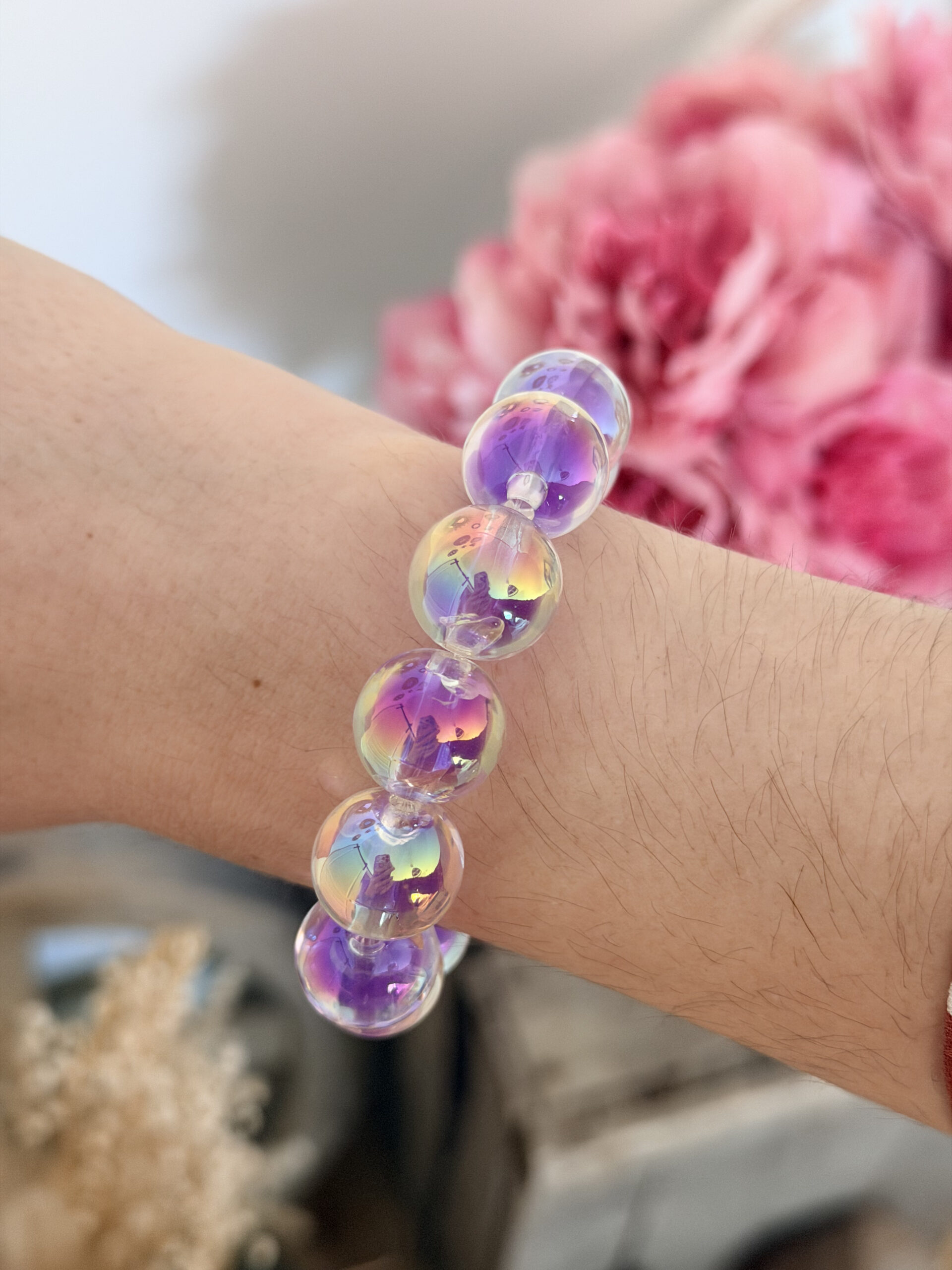 Bien que la résine soit résistante, il est préférable de ne pas exposer ton bracelet à l’eau pendant de longues périodes, comme sous la douche ou à la piscine. Cela aide à préserver l’éclat des perles.