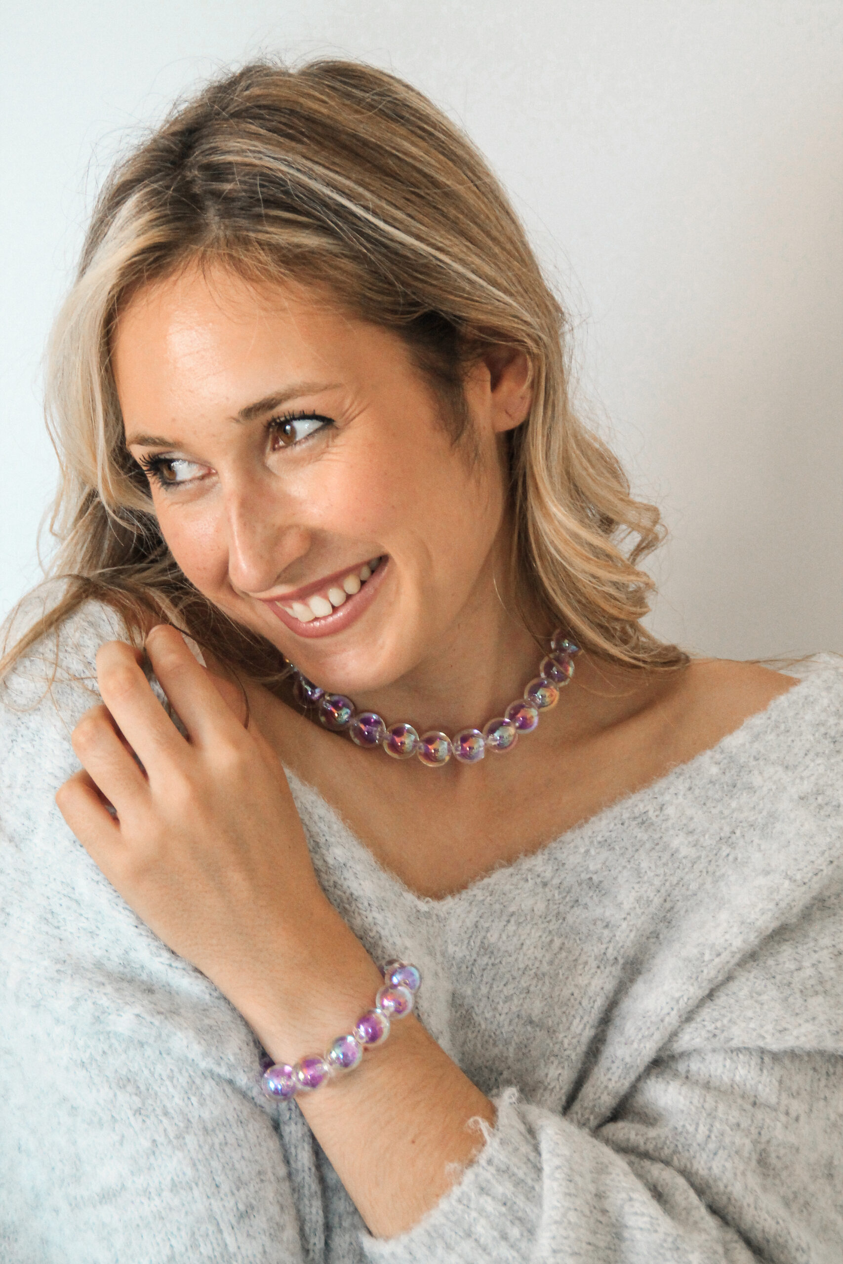 Le collier Bulle d’Amour est composé de perles imitation bulle, au fini lumineux et irisé.