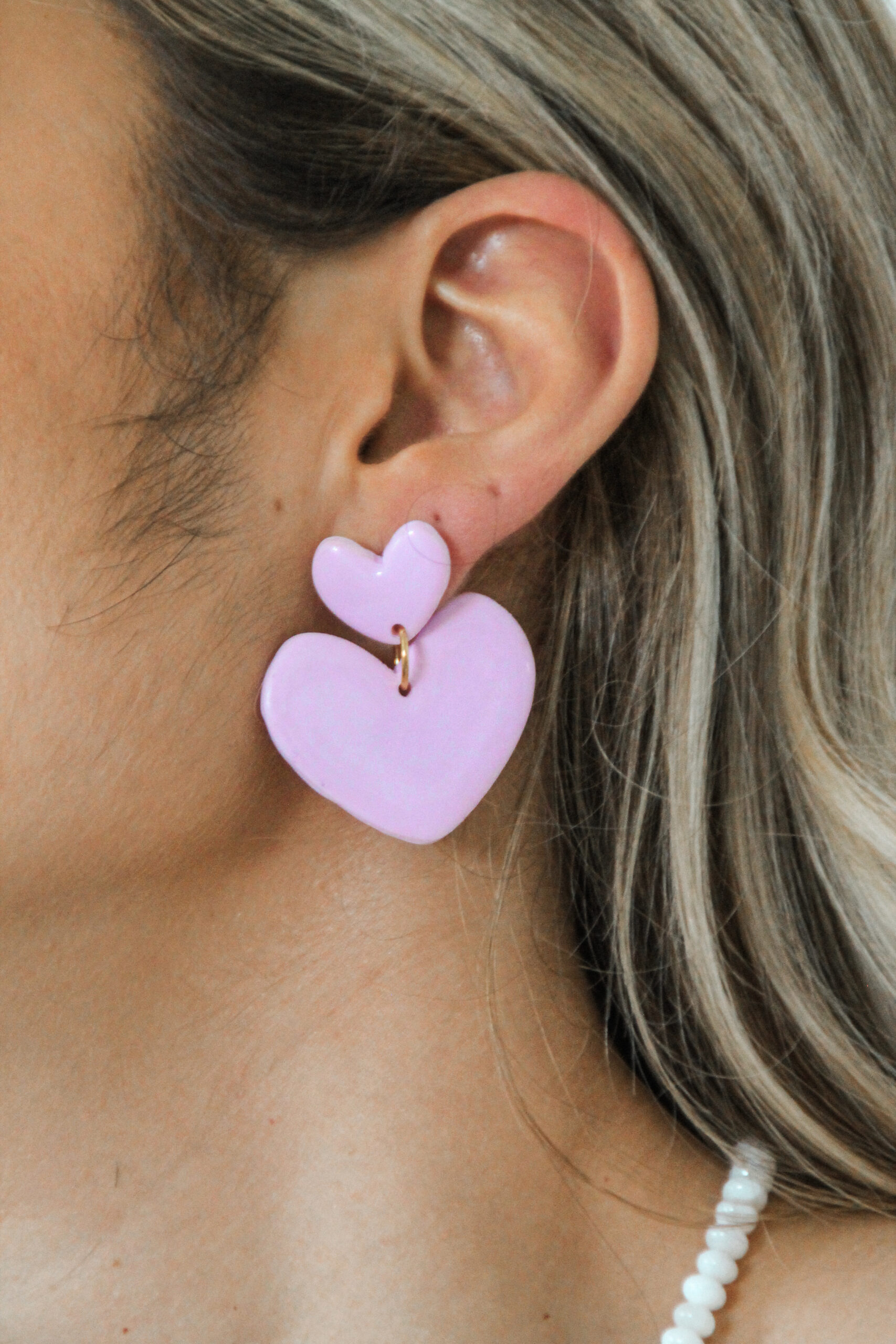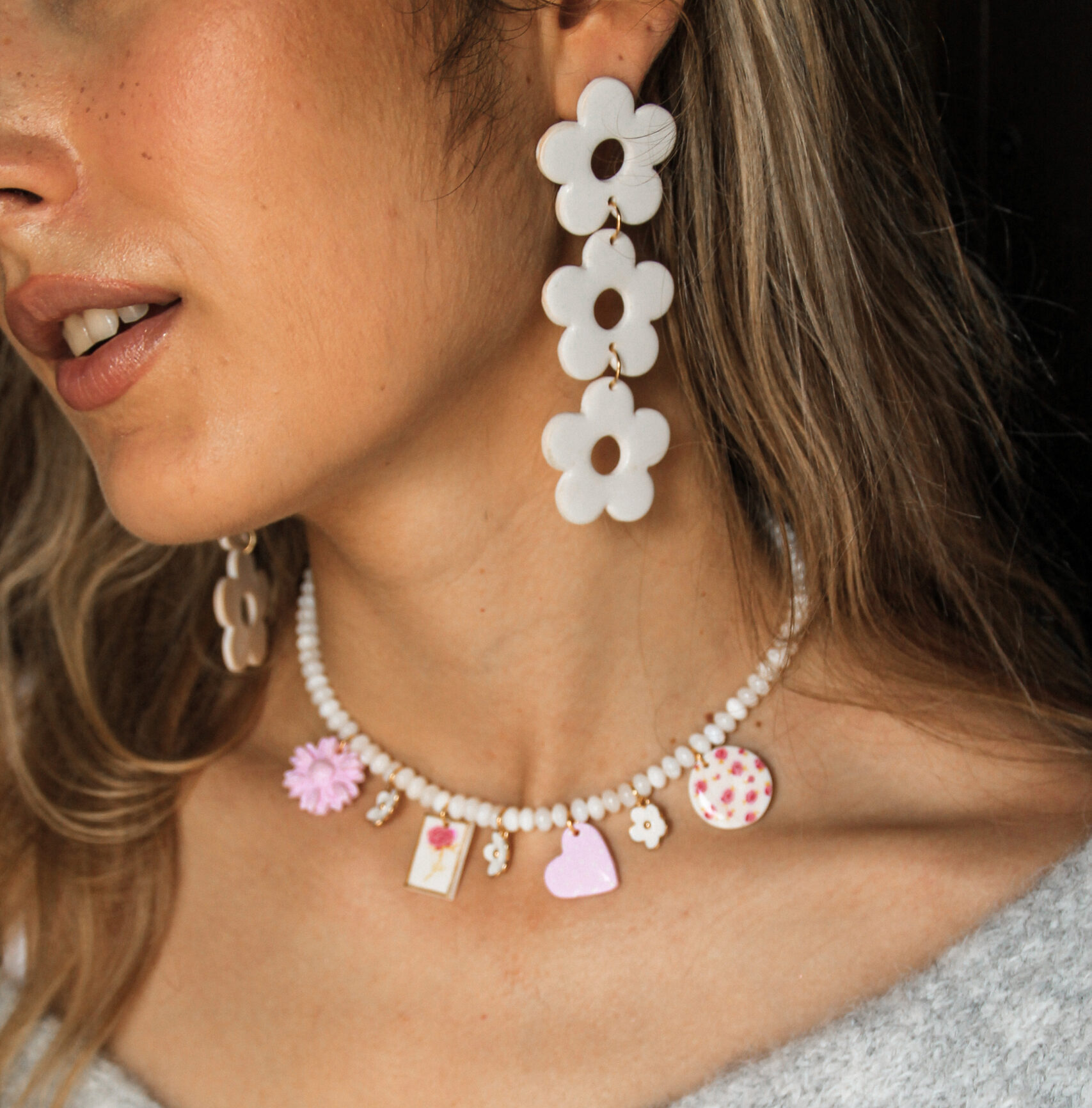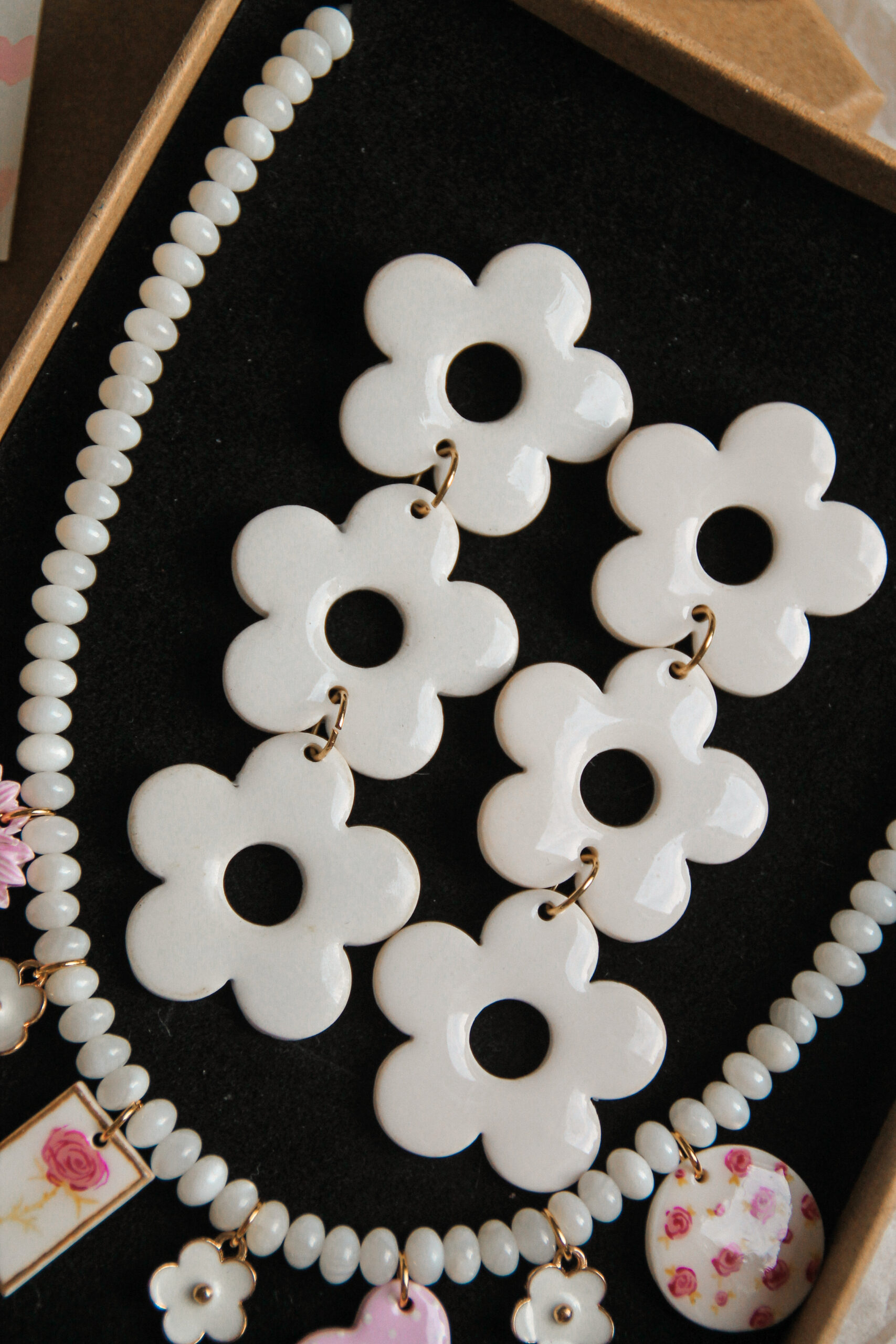 | Boucles d'oreilles | Pendantes coeur rose, Pendantes 3 fleurs blanches, Puces fleurs rose |