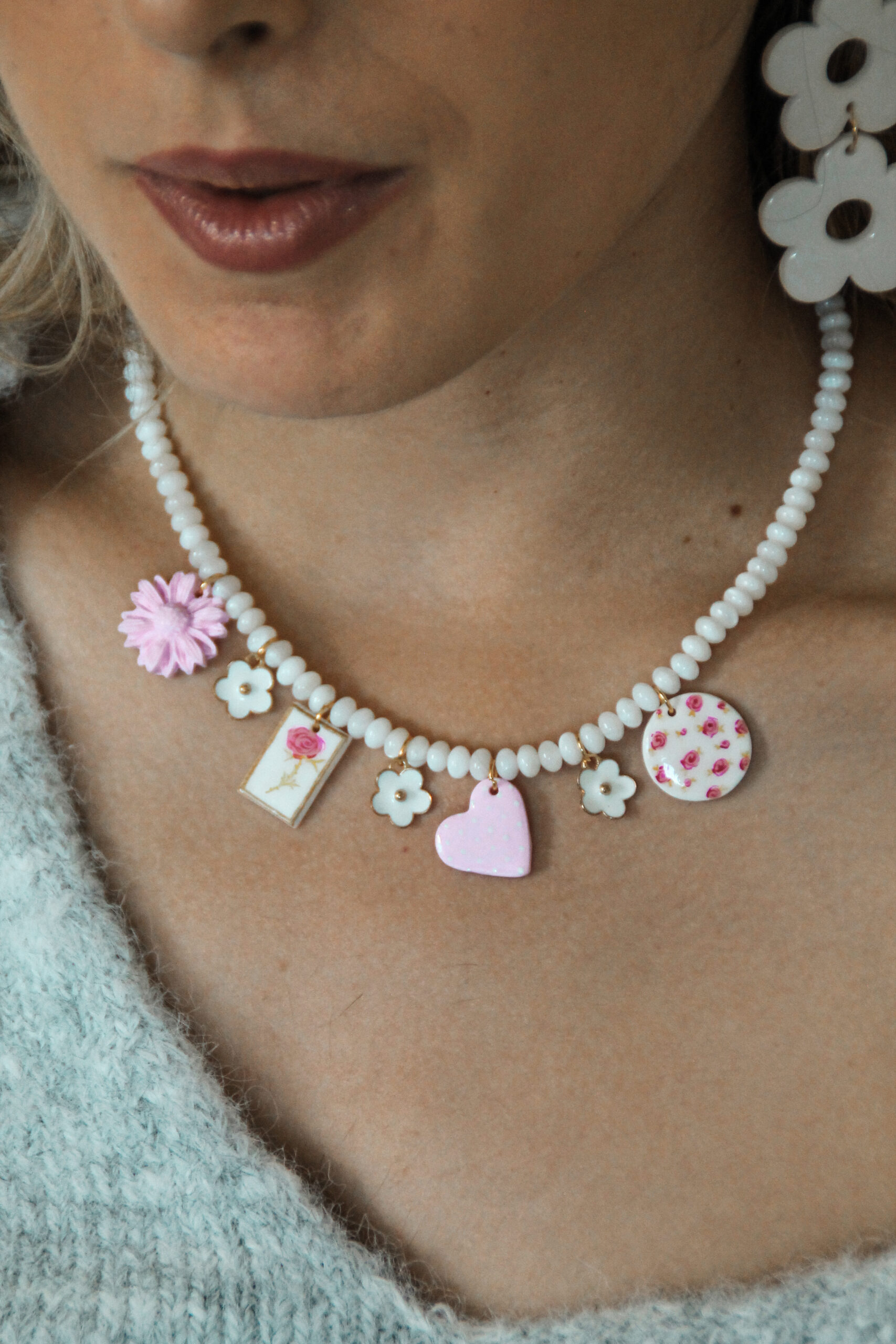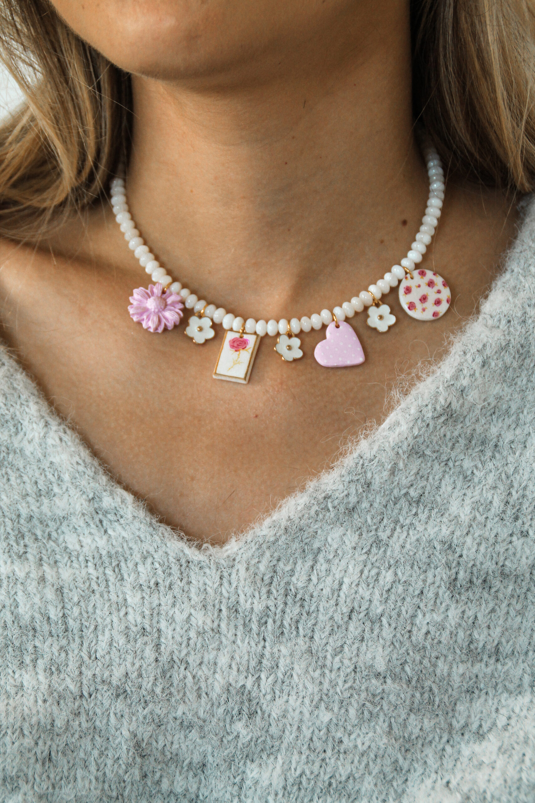Sept charm’s composent ce bijou romantique, dont quatre sont dessinés et peints à la main au pinceau, rendant chaque pièce absolument unique.