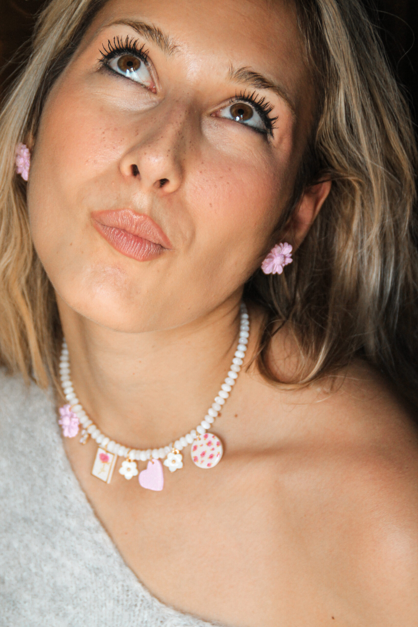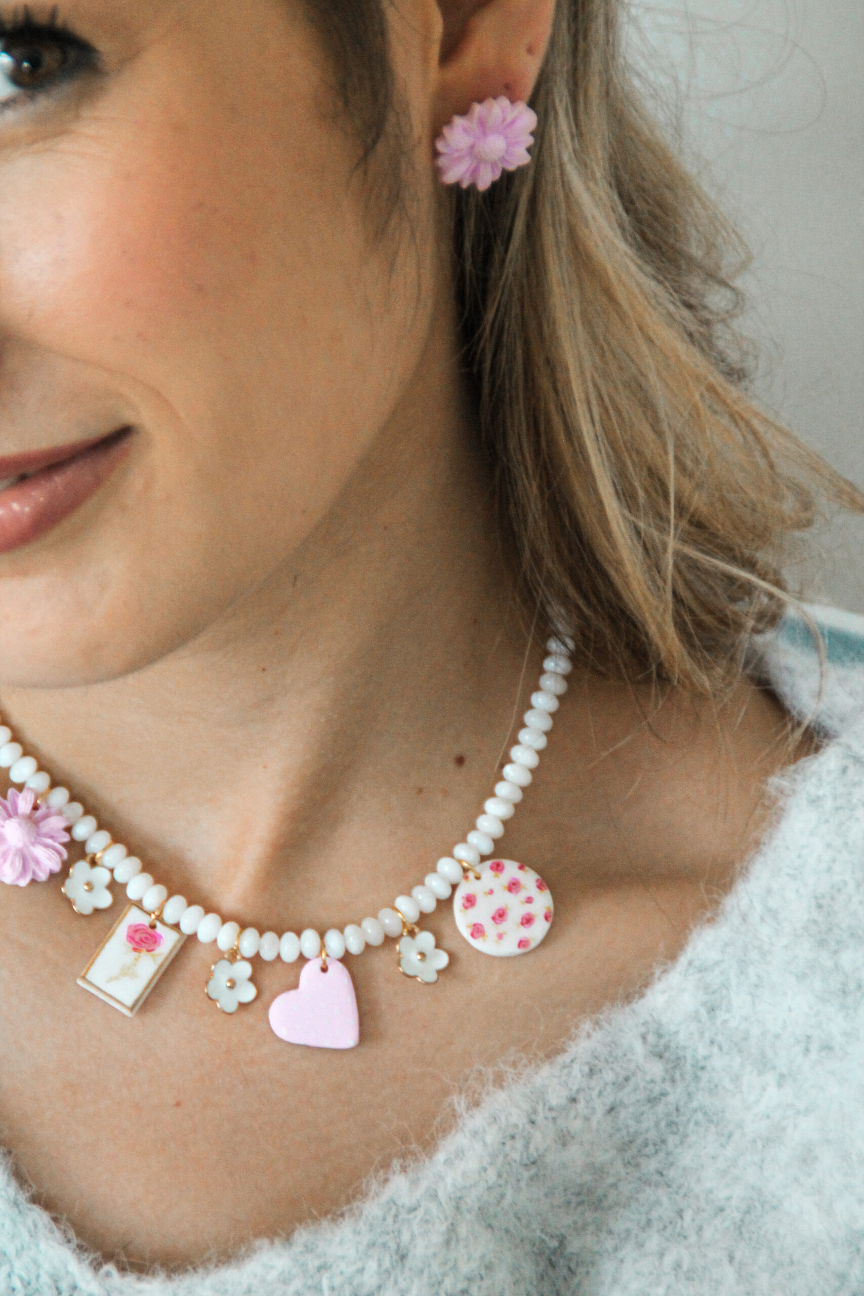 Sept charm’s composent ce bijou romantique, dont quatre sont dessinés et peints à la main au pinceau, rendant chaque pièce absolument unique.