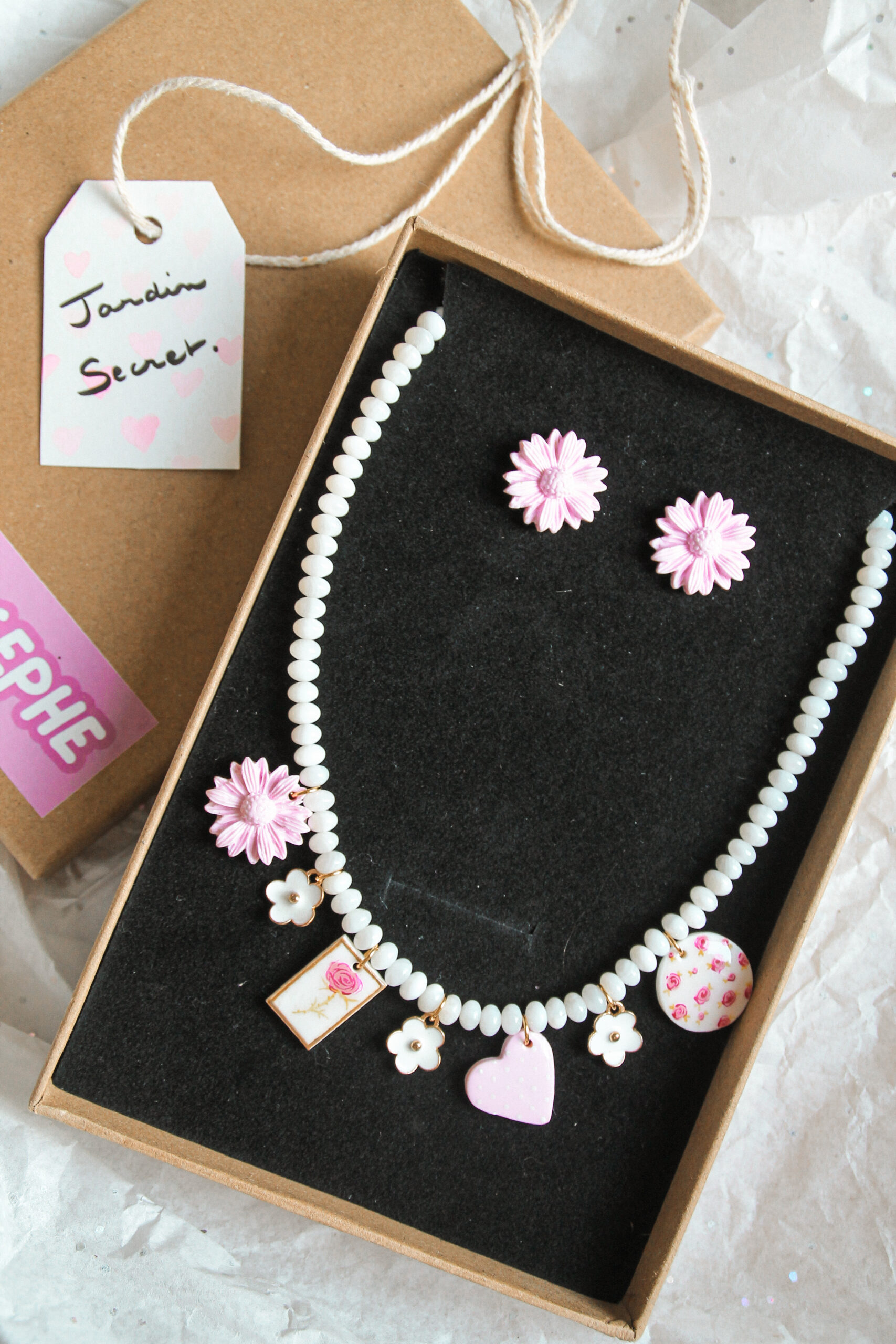 Le Coffret Jardin Secret capture la beauté d’un jardin intime, entre fleurs peintes à la main et perles de coquillage qui reflètent la lumière.