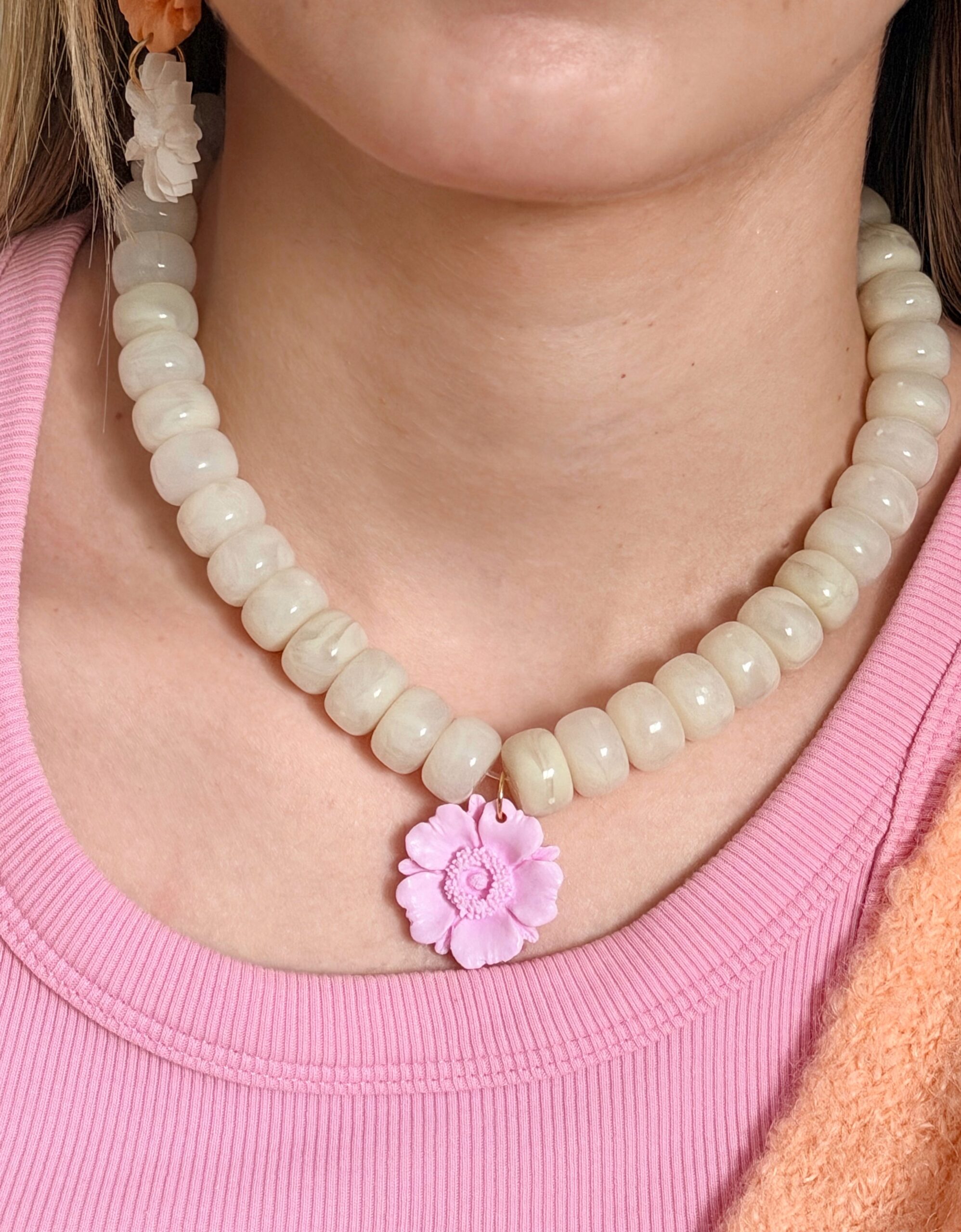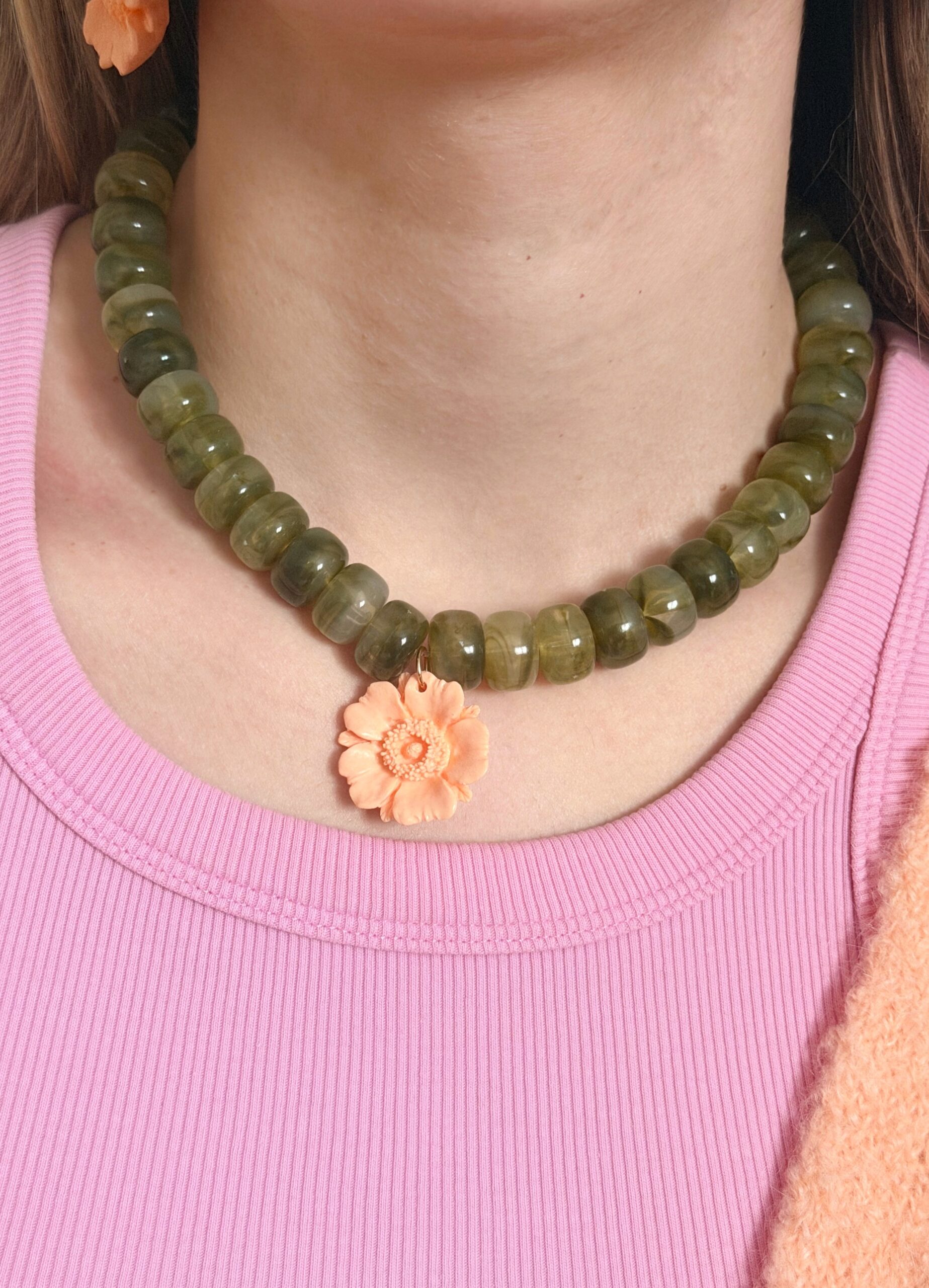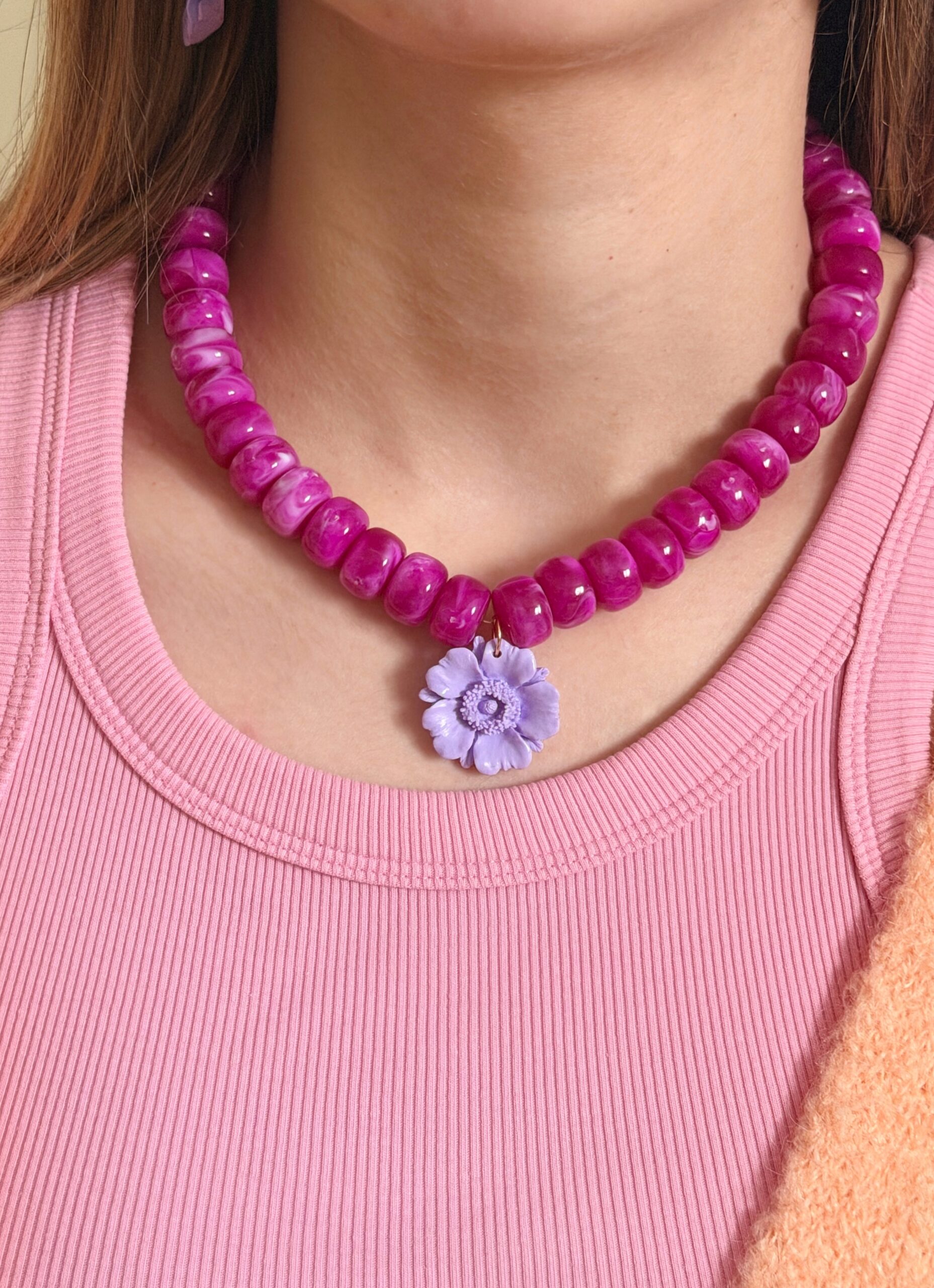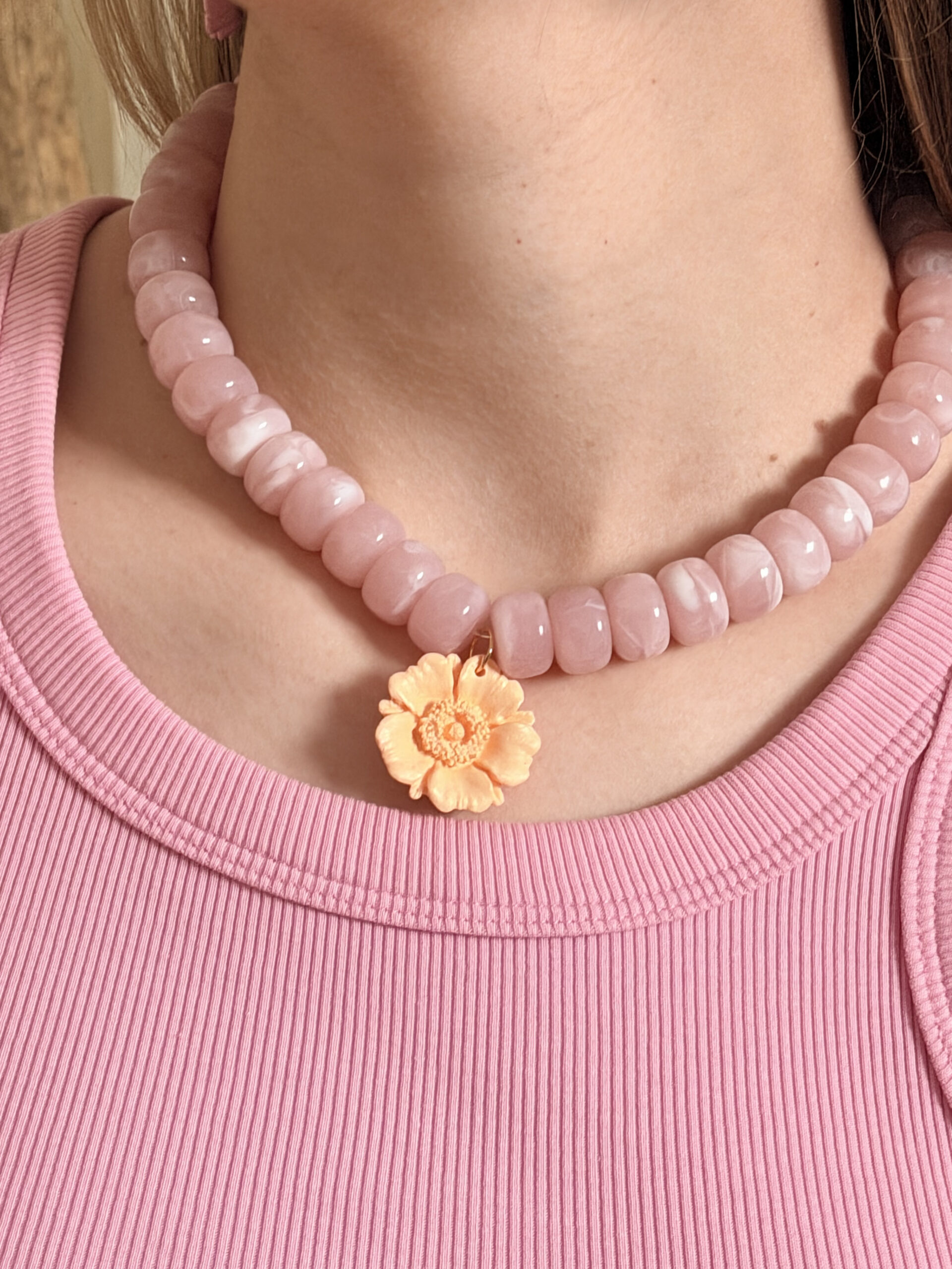 Les perles en acrylique sont légères et résistantes, mais peuvent se rayer en cas de contact avec des surfaces abrasives ou subir des chocs. Range ton collier séparément pour éviter les frottements avec d’autres bijoux.
