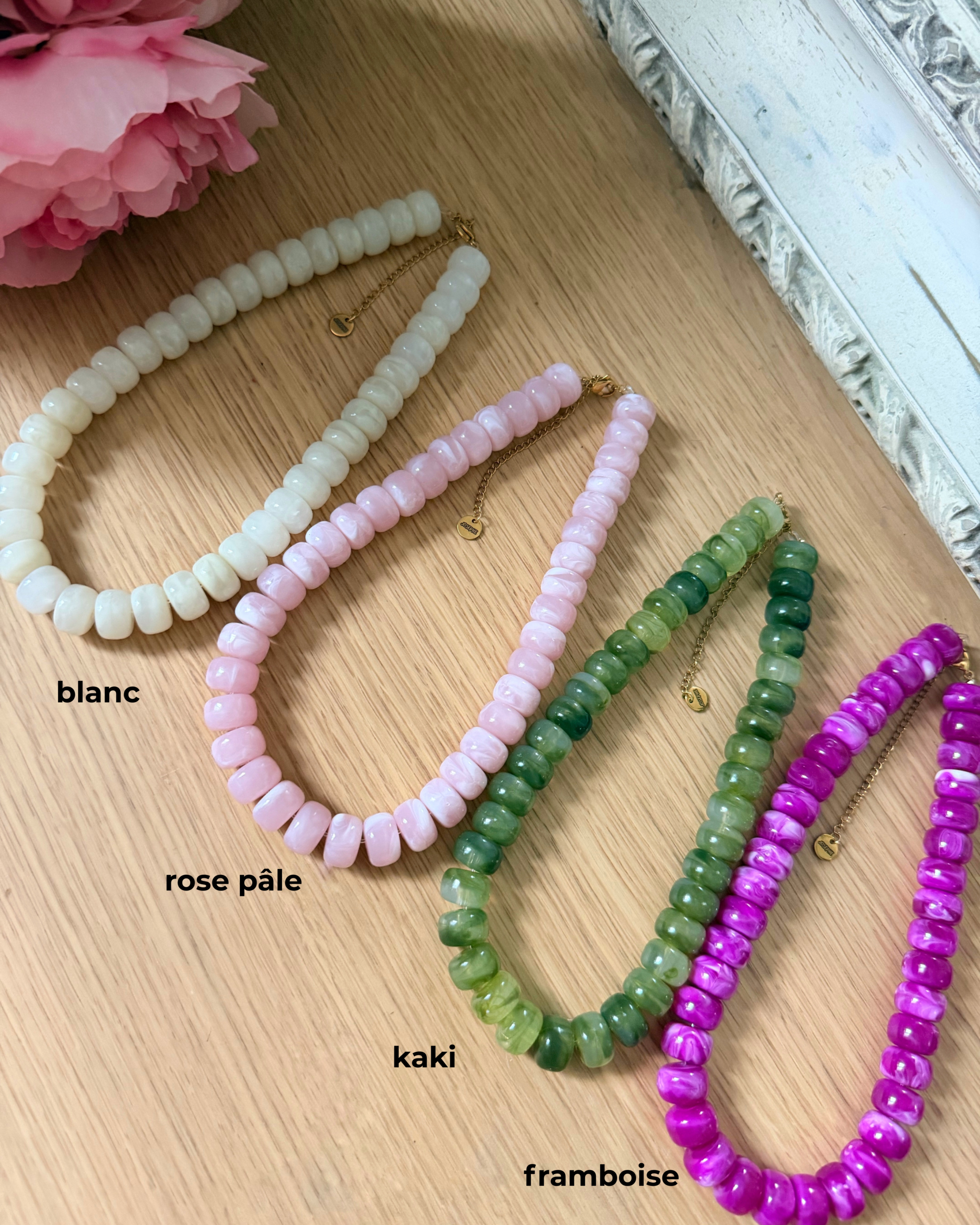 🎨 Couleurs du collier : kaki, blanc, rose pâle, framboise